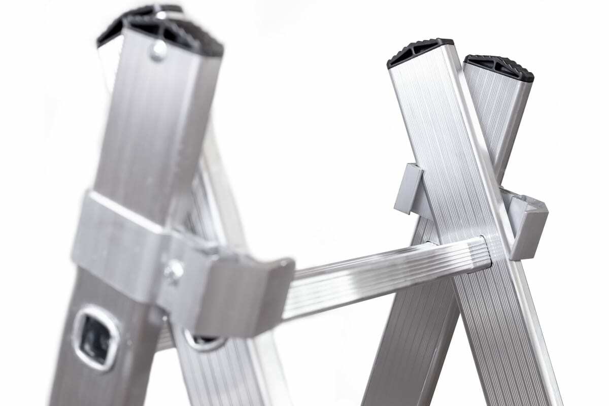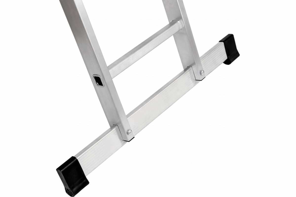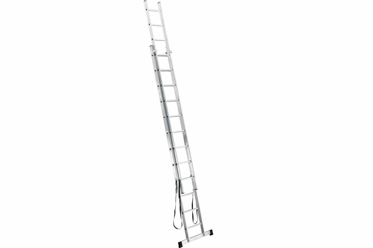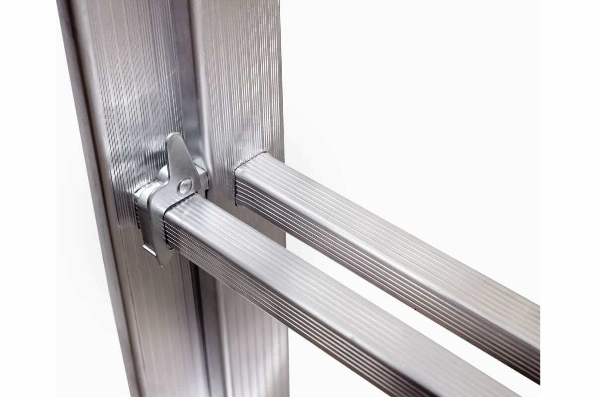 Имеет широкие алюминиевые скобы, обеспечивающие плотный зажим выносной секции и прочные страховочные стяжки, предохраняющие лестницу от самопроизвольного раскладывания.