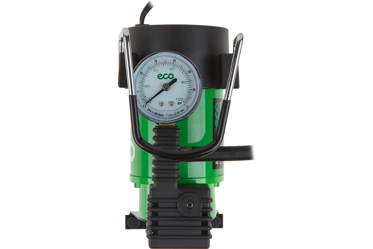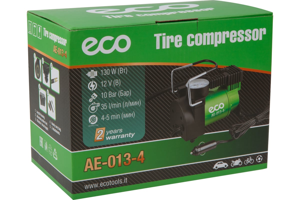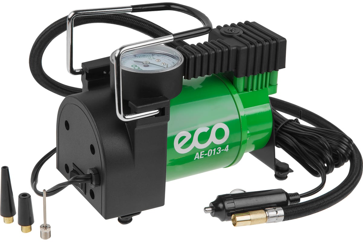 ECO 12151 AE-013-4 — компактный и производительный поршневой компрессор, предназначенный для быстрой накачки шин легковых автомобилей, внедорожников и коммерческого транспорта. Модель отличается стабильной работой при низких температурах и высокой скоростью нагнетания воздуха. Прочный металлический корпус эффективно отводит тепло, что позволяет устройству работать дольше без перерыва на охлаждение.
