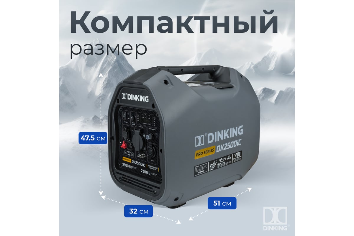Dinking DK2500iC — это компактный и тихий инверторный генератор номинальной мощностью 2.0 кВт (максимальная — 2.2 кВт). Главная особенность модели — двойное преобразование тока, что на выходе дает идеальную синусоиду. Это позволяет напрямую подключать чувствительную электронику: газовые котлы, ноутбуки, серверы и медицинское оборудование. Благодаря закрытому шумозащитному кожуху и экономичному двигателю, генератор отлично подходит для использования в квартирах (на балконах при наличии вентиляции), в походах, на рыбалке или как резервный источник света для частного дома.