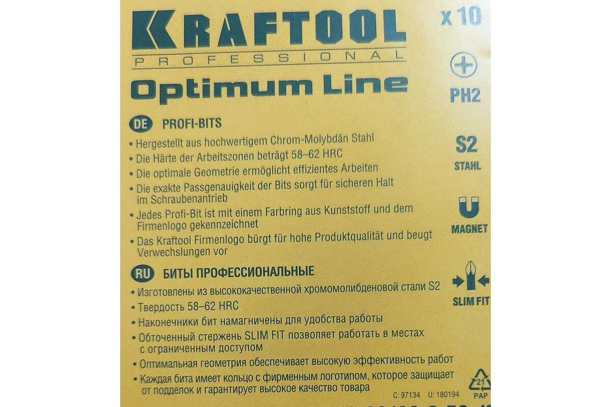 Биты KRAFTOOL 26122-2-50-10 изготовлены из стали S2, которая отличается особой прочностью, а значит биты подходят для профессионального использования на строительных площадках.