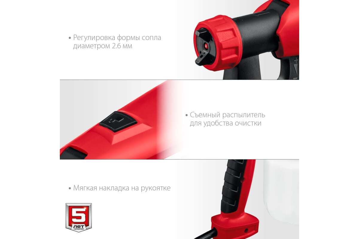 - Регулировка формы сопла для горизонтальной и вертикальной окраски, а также для труднодоступных поверхностей