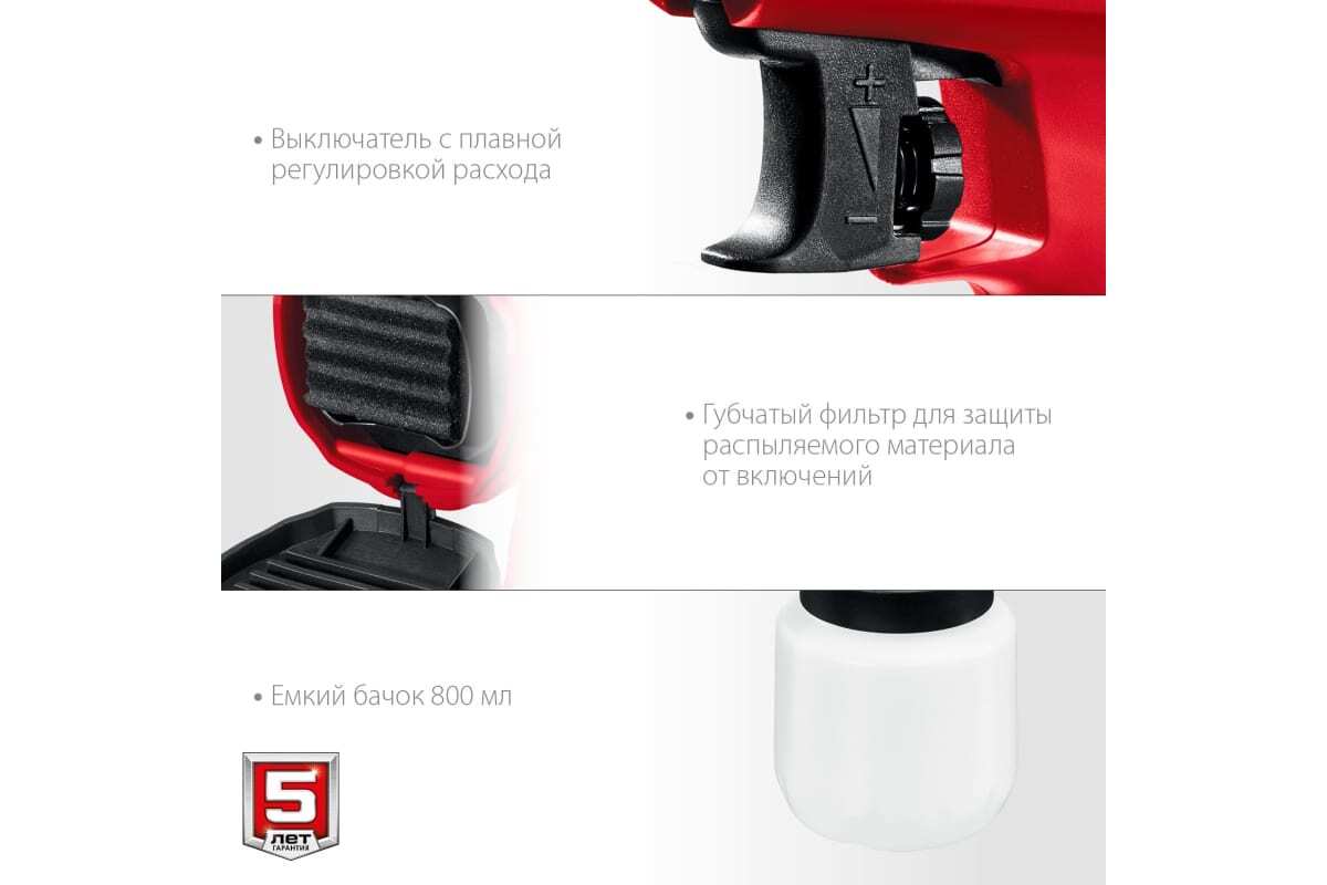 - Расходная емкость объемом 800 мл позволяет длительно работать на одной заправке и не нагружает руки оператора
