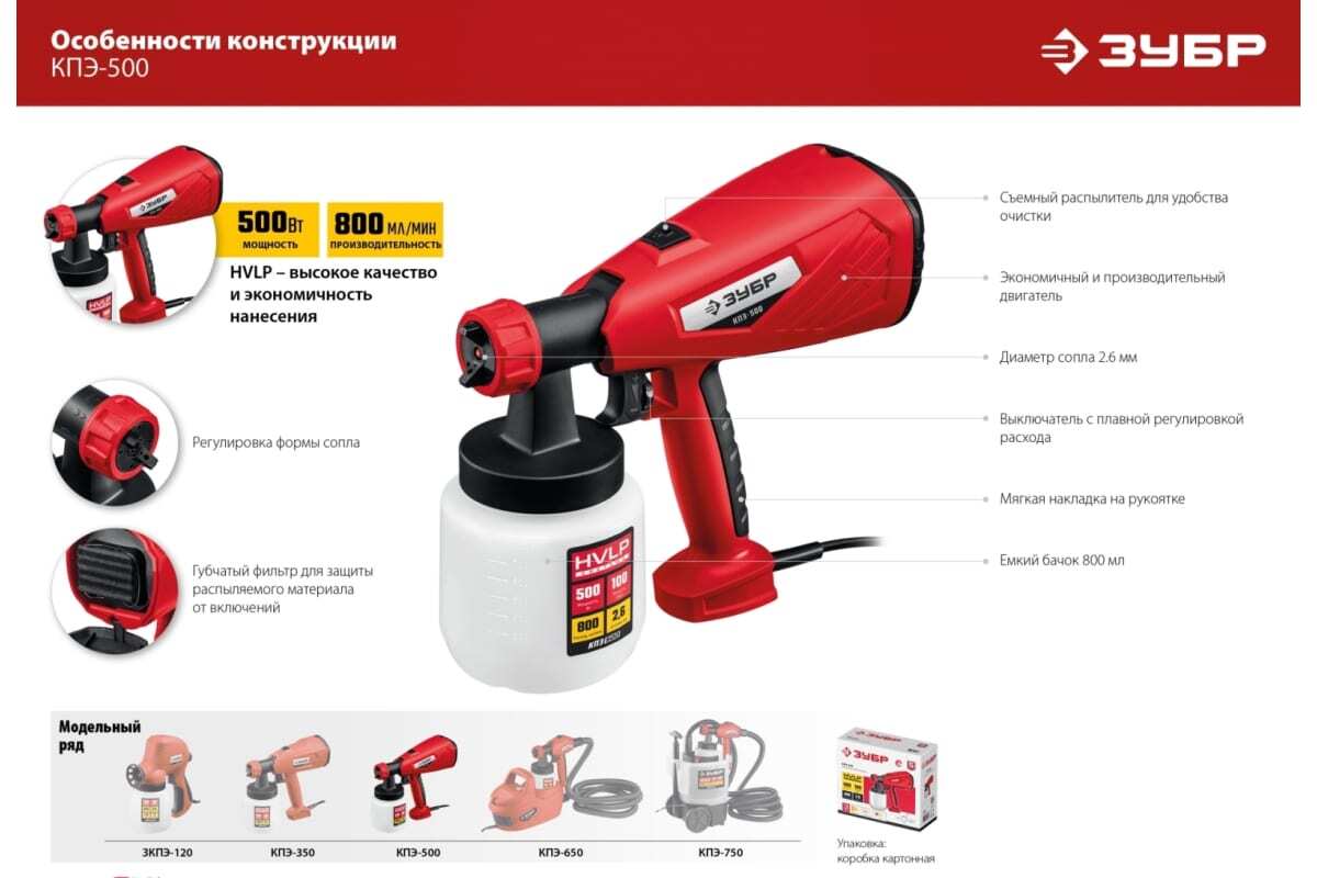 Электрический краскопульт ЗУБР 500 Вт КПЭ-500 служит для распыления красок, лаков и прочих растворимых материалов. Современная технология нанесения исключает затраты на расходные материалы, уменьшает расход и предотвращает образование подтеков.