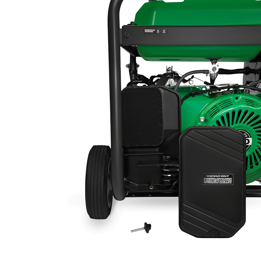 Мобильность и эргономика: В комплект уже включены усиленные транспортировочные колеса и складные рукоятки для легкого перемещения генератора весом 90 кг одним человеком.