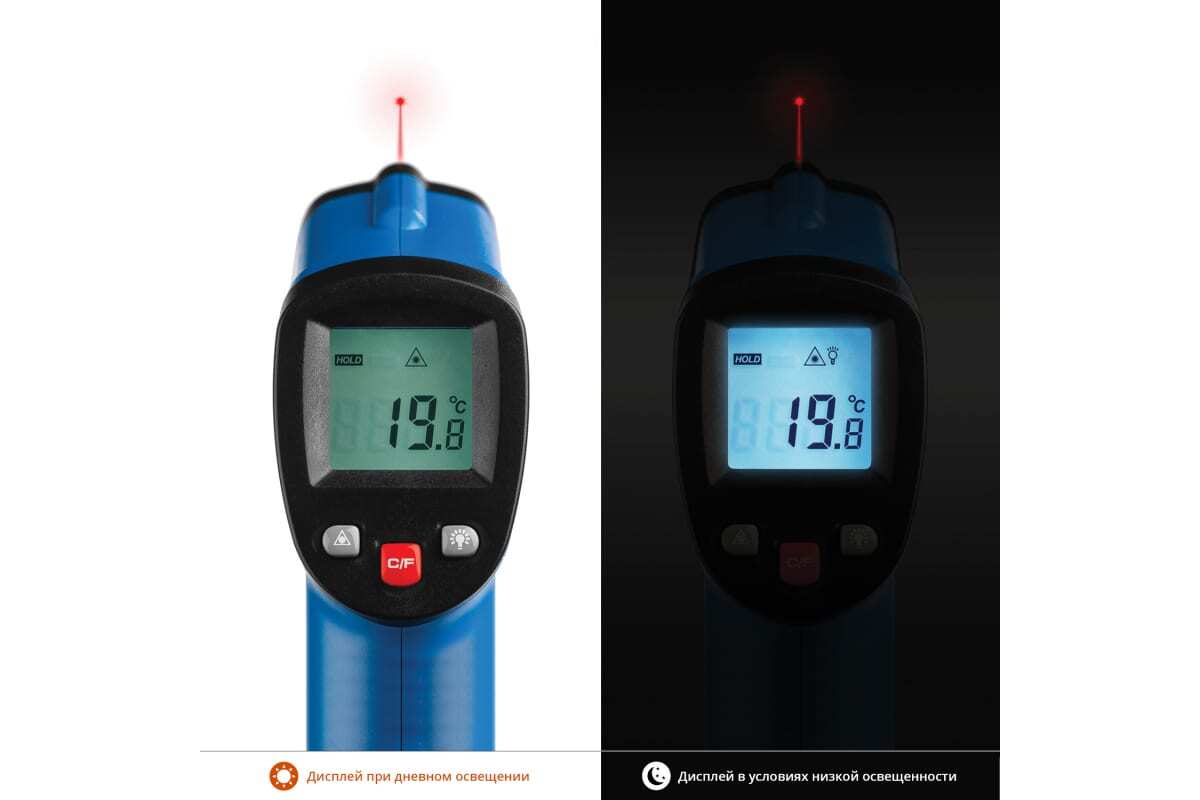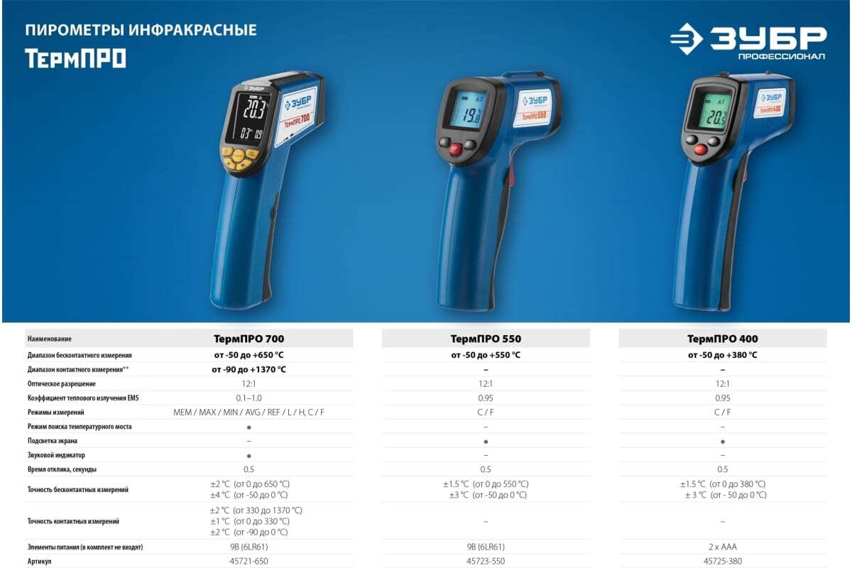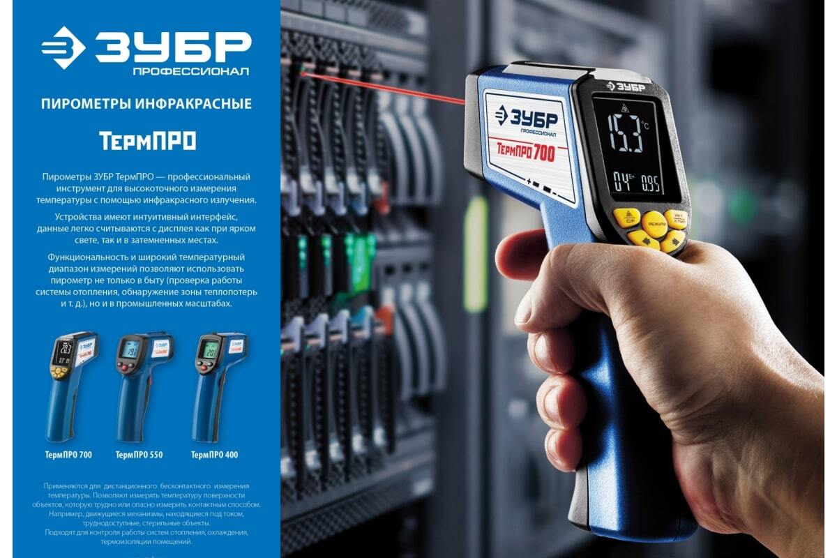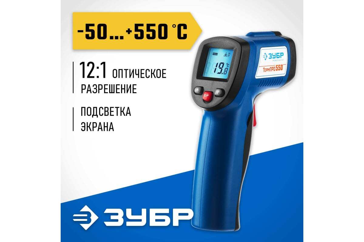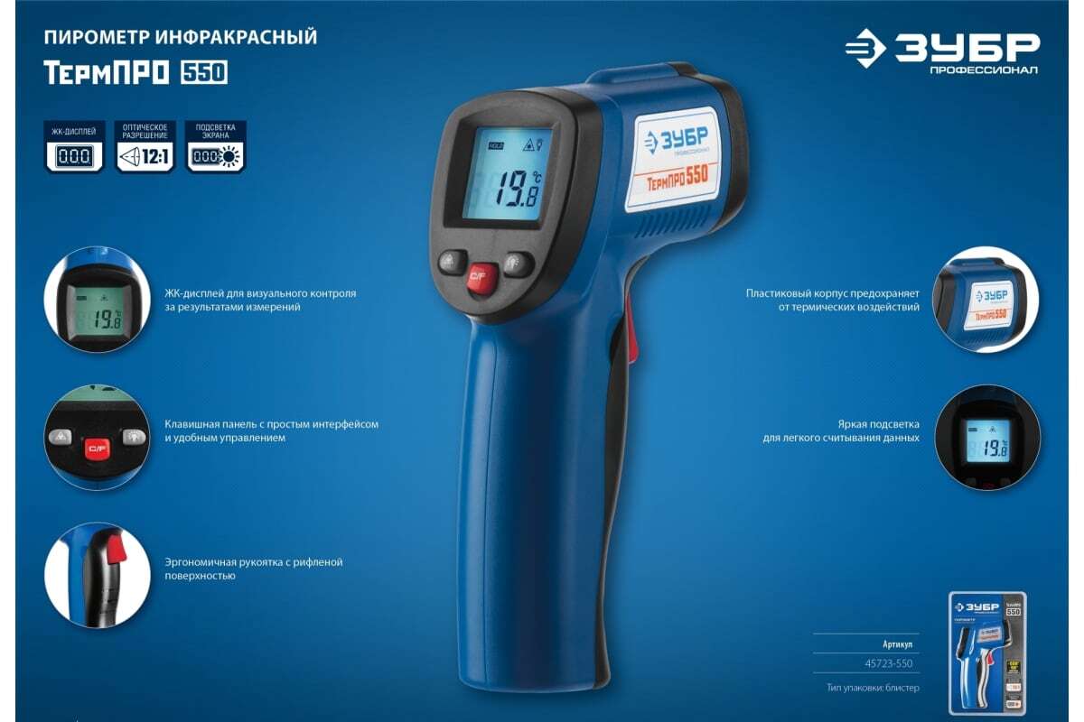 Инфракрасный пирометр ЗУБР ТермПро-550 45723-550 позволяет определить температуру поверхности различных объектов бесконтактным способом. Принцип действия пирометра базируется на том, что все материальные тела излучают электромагнитную энергию, а интенсивность и спектр излучения этой энергии напрямую зависит от их температуры. Пирометр определяет характеристики электромагнитного излучения и на их основании автоматически вычисляет, до какой температуры нагрет объект измерения. Время измерения занимает не более секунды.