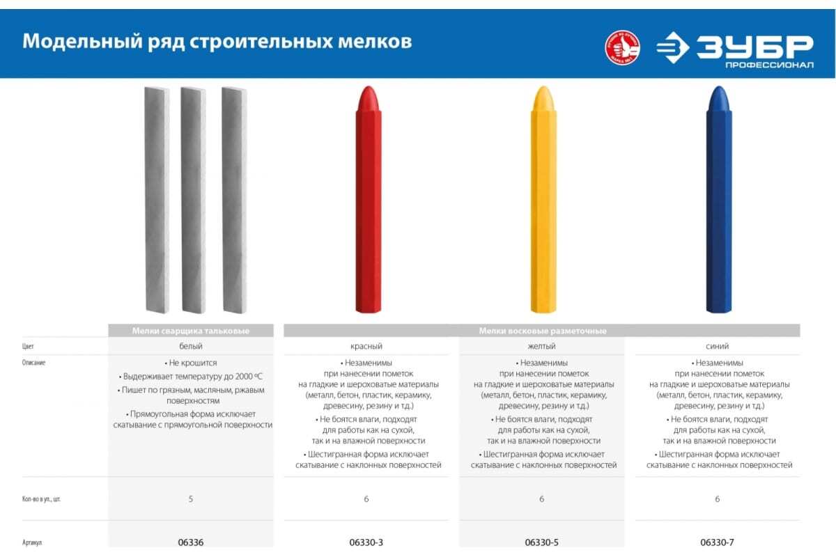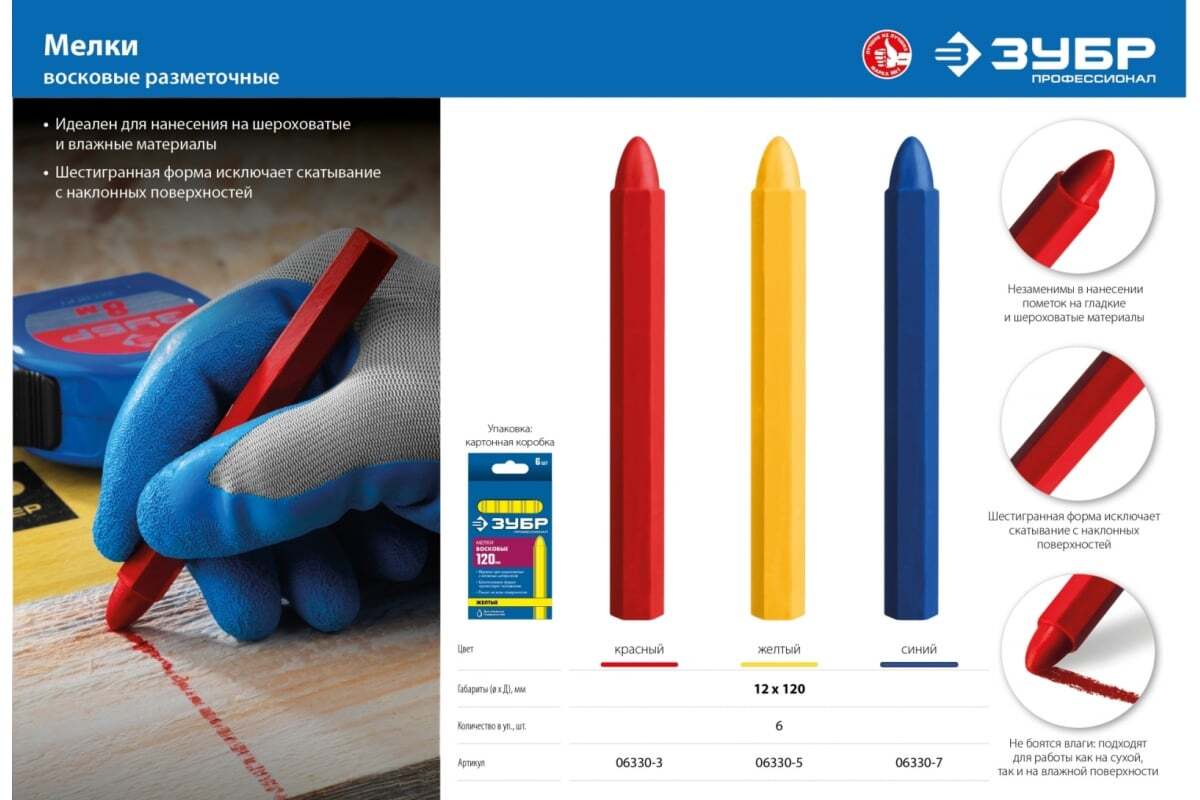 Преимущества мелков ЗУБР 06330-3- Незаменимы при нанесении пометок на шероховатые материалы (металл, бетон, пластик, керамику, древесину, резину и тд)