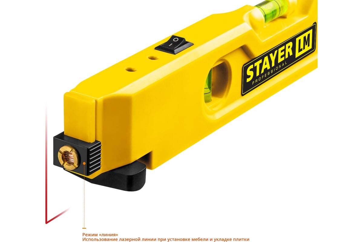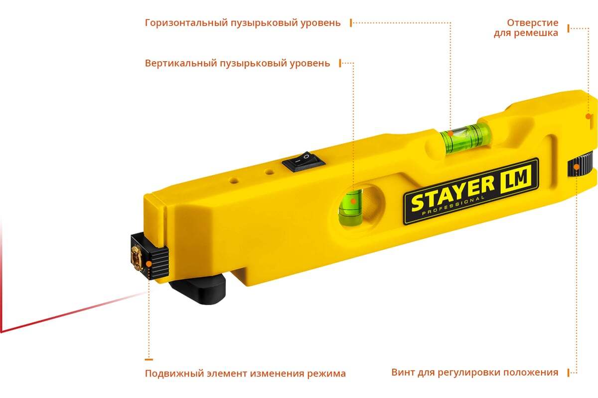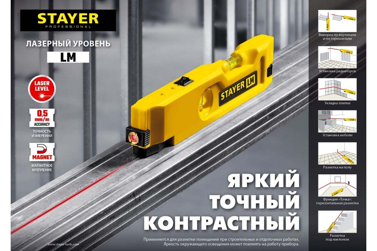 Лазерный уровень STAYER LM 34985 используется при отделке помещений, монтаже дверей и окон, укладке плитки и прочих декоративных работах.
