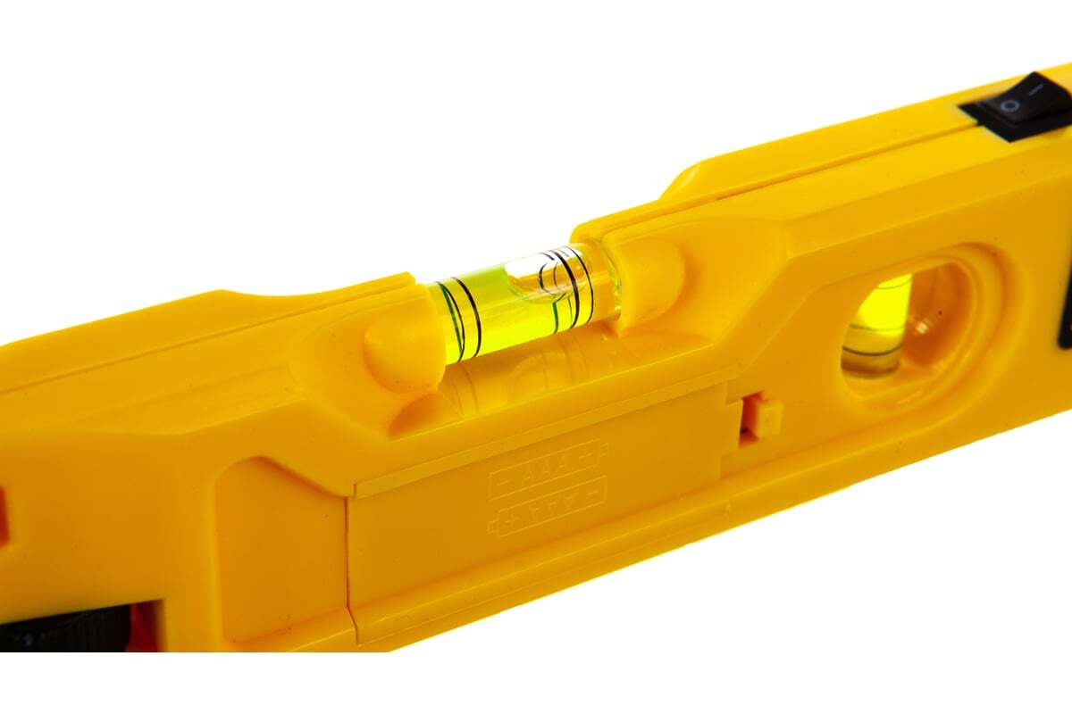 Модель оснащена горизонтальным и вертикальным пузырьковым уровнем для точного выравнивания.