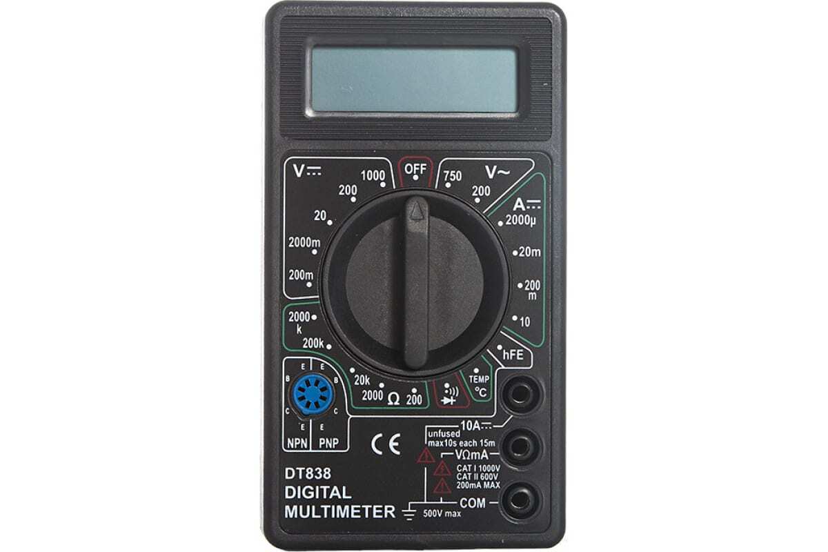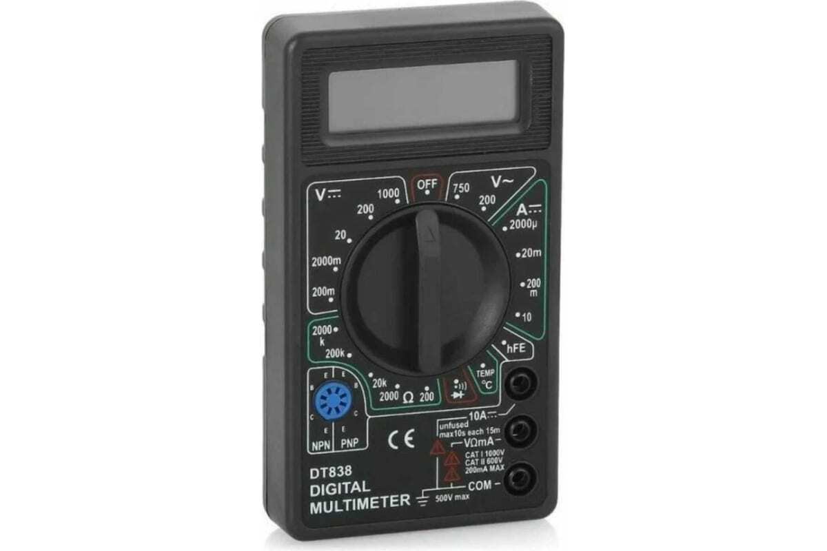 Мультиметр DT 838 - это цифровой многофункциональный измерительный прибор, также называемый универсальным тестером. С его помощью можно узнать значения сопротивления, напряжения и силы тока на участке цепи. Кроме того, можно проверить целостность электрической цепи и многие радиодетали, например, транзисторы или диоды. Функционально мультиметр заменяет несколько измерительных устройств: вольтметр, амперметр, омметр. Это очень удобно иметь компактное устройство, способное измерить практически всё.