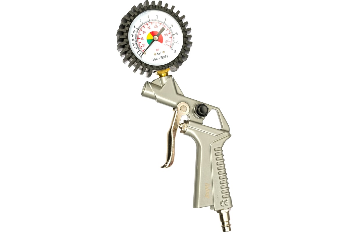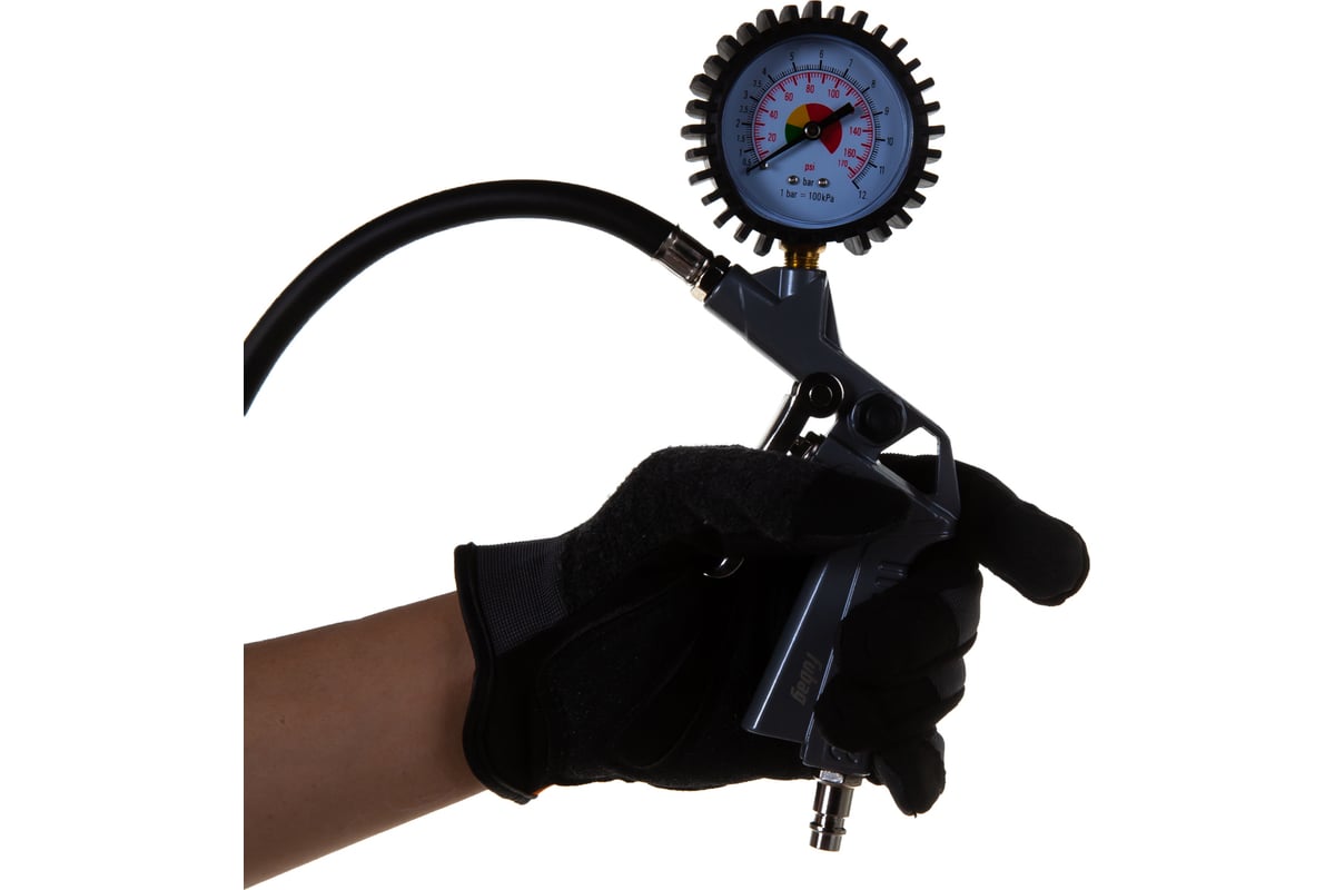 Пистолет для подкачки шин: оснащен манометром для контроля давления и гибким шлангом с зажимом.