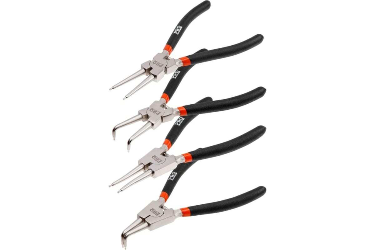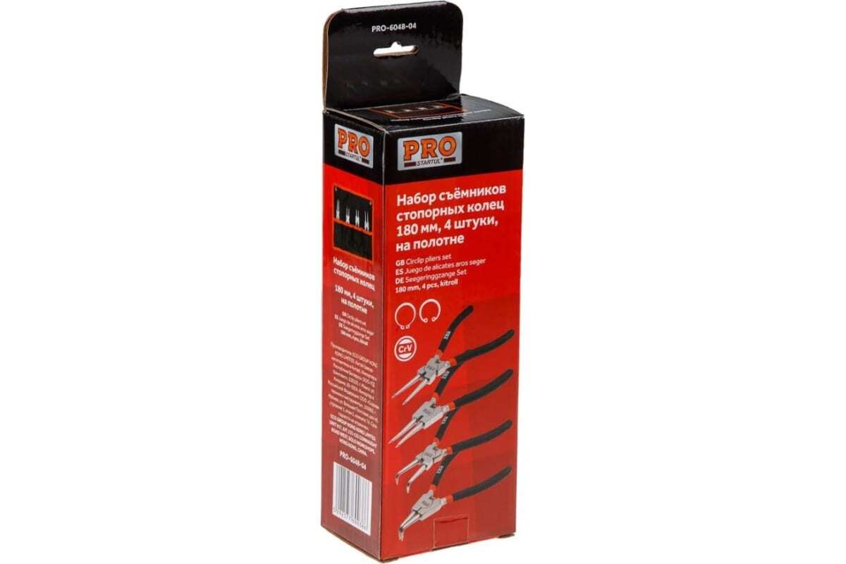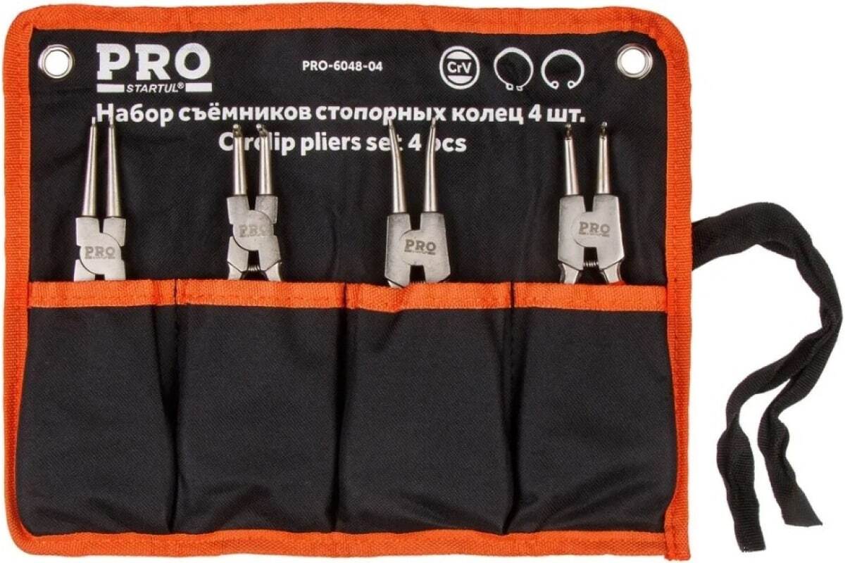 Набор съемников стопорных колец на полотне 4 предмета PRO STARTUL (PRO-6048-04) предназначен для монтажа и демонтажа внешних и внутренних стопорных колец. Съемники в комплекте: прямой на сжим, прямой на разжим, 90° на сжим, 90° на разжим. Возвратная пружина: есть. Рукоятки: обливные.