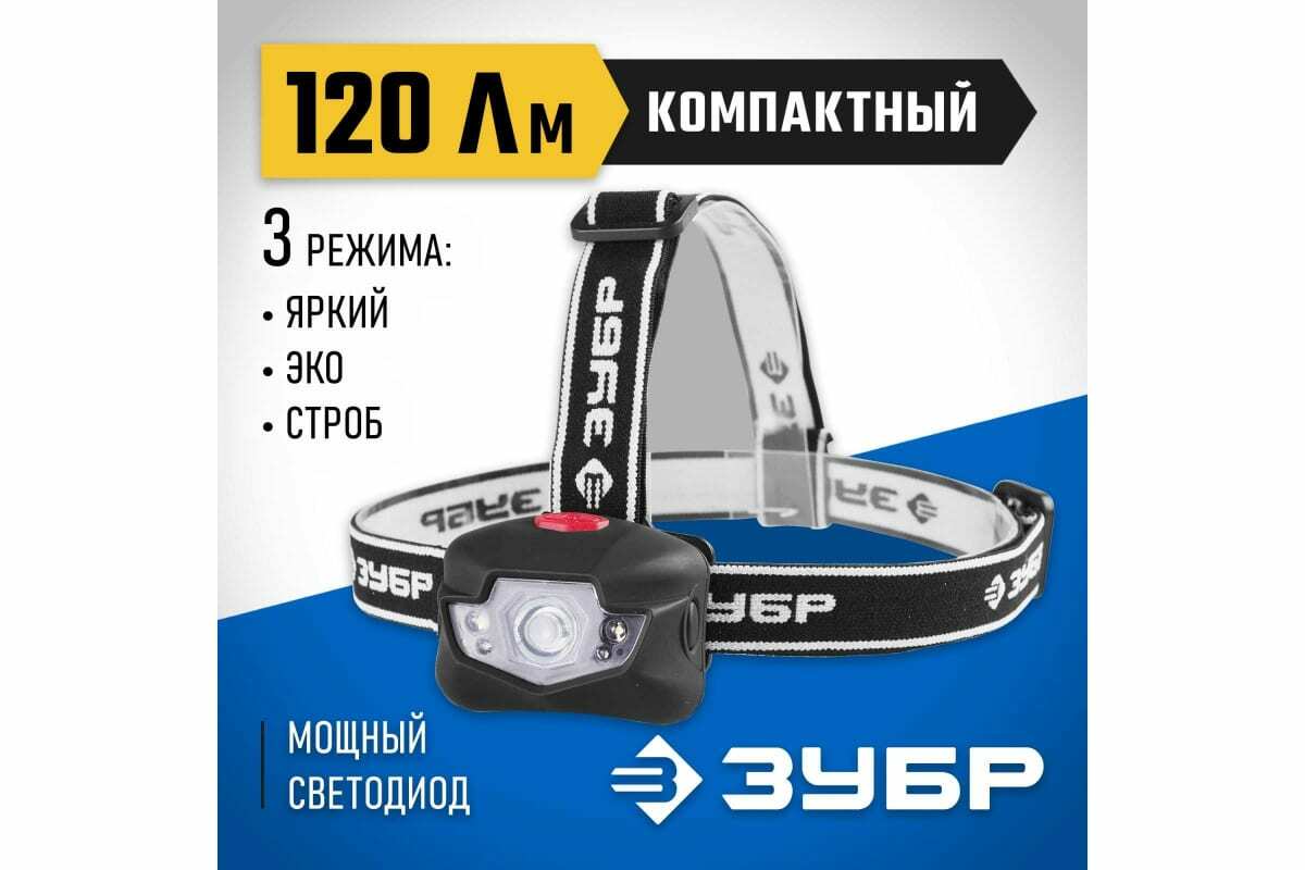 - Сниженный вес налобного светодиодного фонаря 3Вт, 120Лм +4LED, линза коллиматор, 3 режима, 3ААА Зубр ЭКСПЕРТ 56434;