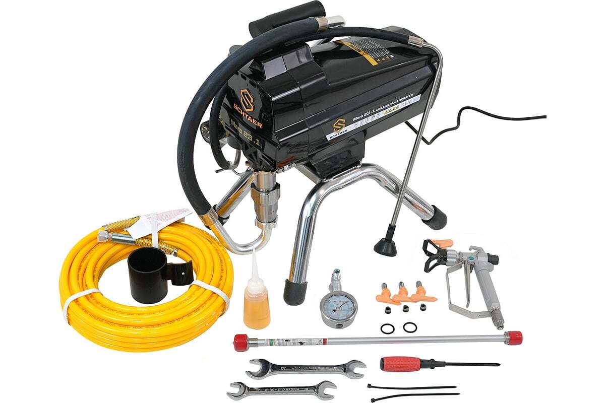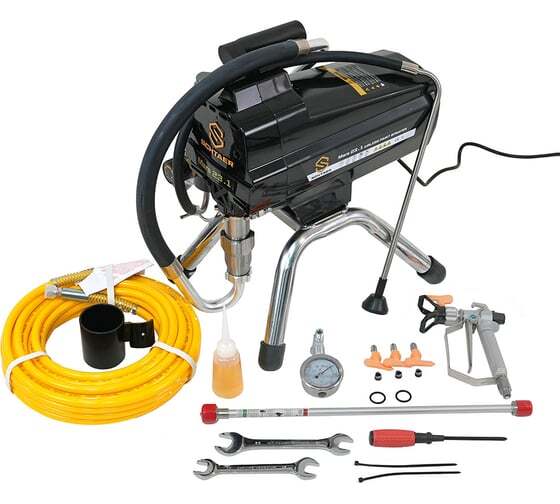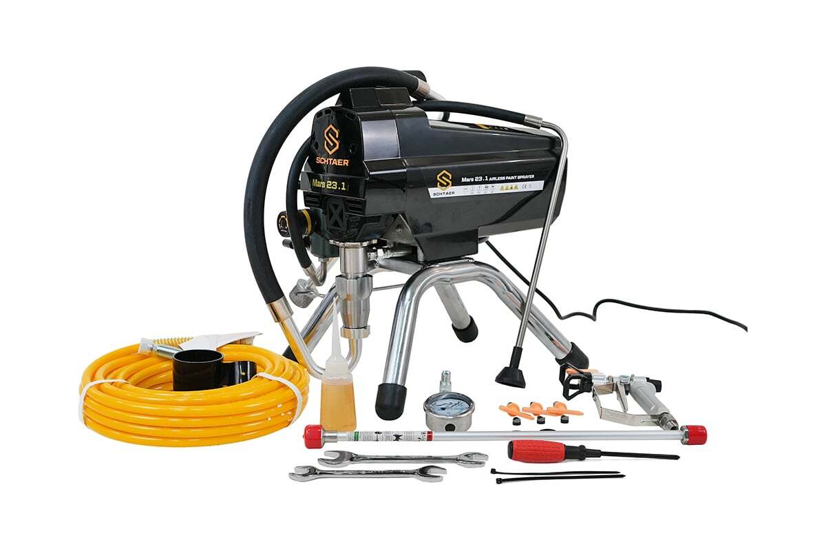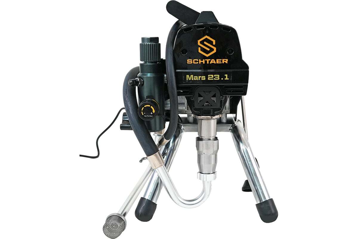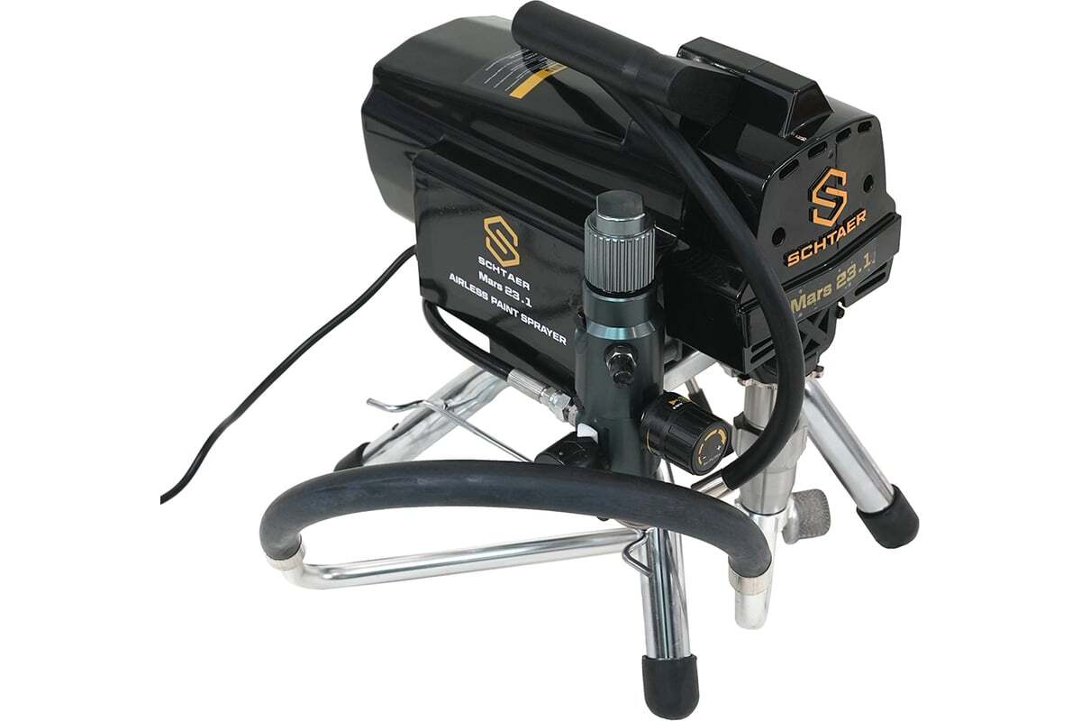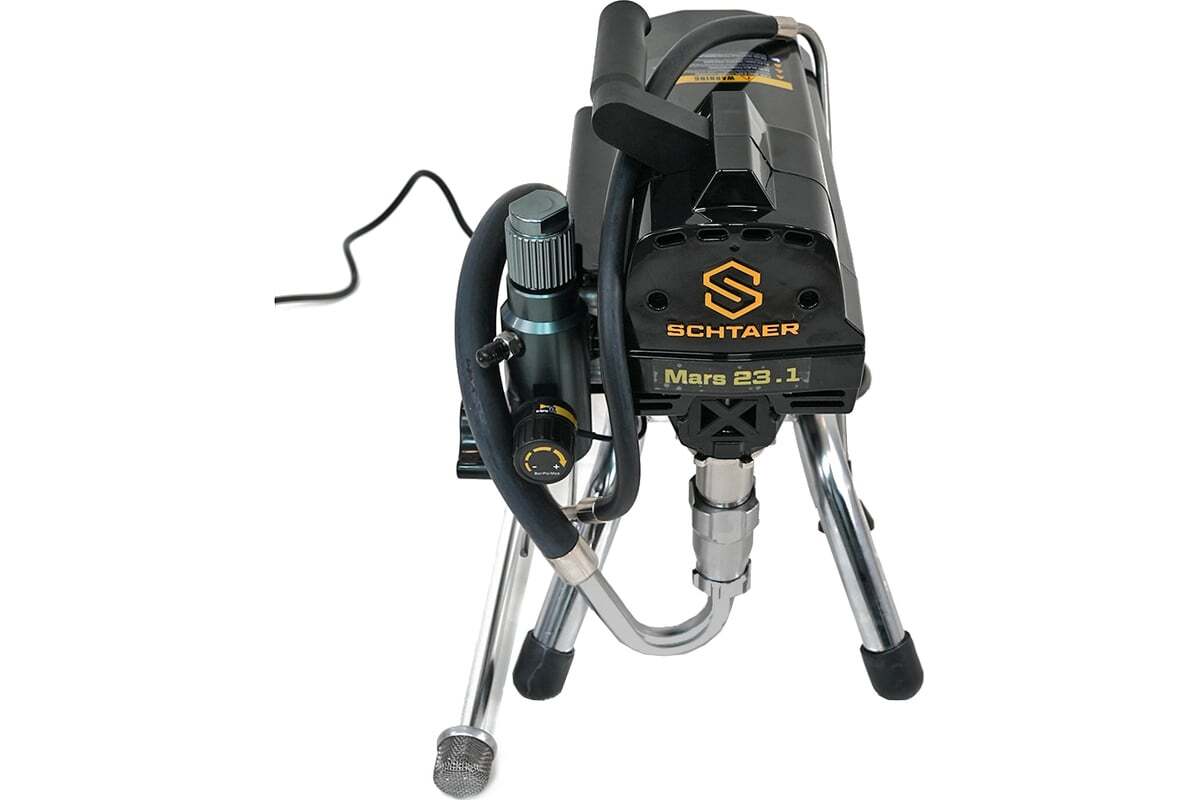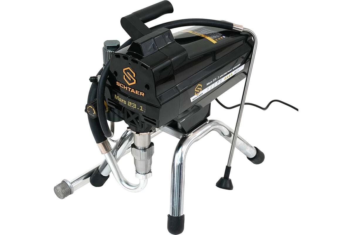 Schtaer Mars 23.1 - аппарат безвоздушного распыления интерьерных и фасадных ЛКМ. Он работает от электрической сети 220 вольт. Краска поступает в окрасочный аппарат через шланг-заборник, поршневой насос нагнетает давление и подает краску по шлангу на краскопульт. Факел формируется на специальной форсунке с тонким сечением.