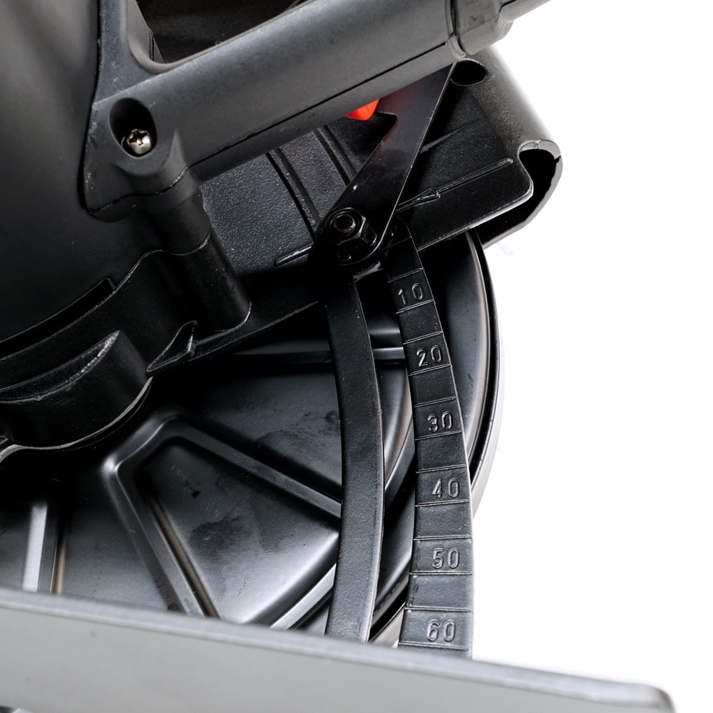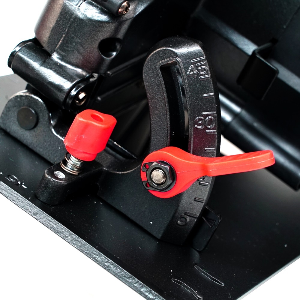 - С помощью специального барашкового вентиля можно регулировать угол наклона пилы.