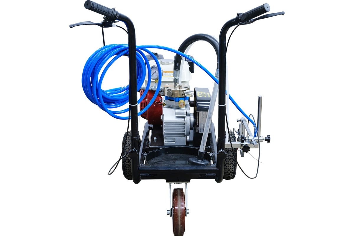 STEM Techno FHX-26B — это профессиональная ручная разметочная машина безвоздушного распыления, предназначенная для нанесения горизонтальной дорожной разметки холодными красками. Модель базируется на бензиновом двигателе Honda GX160 (5.5 л.с.), который приводит в действие мощный поршневой насос. Благодаря компактным размерам и высокой маневренности, машина идеально подходит для работы на небольших и средних объектах: парковках, складских терминалах, спортивных площадках и пешеходных переходах. Технология безвоздушного распыления обеспечивает четкие края линий и экономный расход краски без образования «красочного тумана».