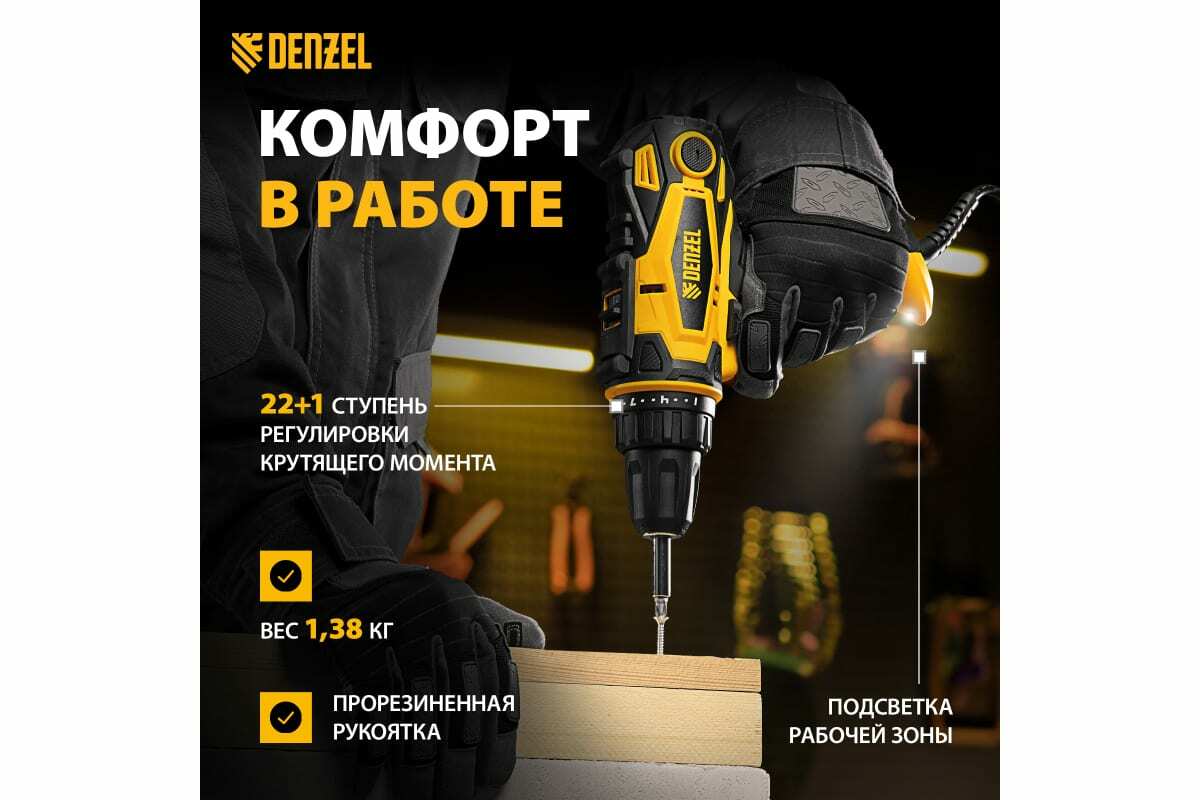 Преимущества Denzel SD-300-10 26201- Регулировка крутящего момента — есть возможность подобрать оптимальное усилие затяжки под тип крепежа