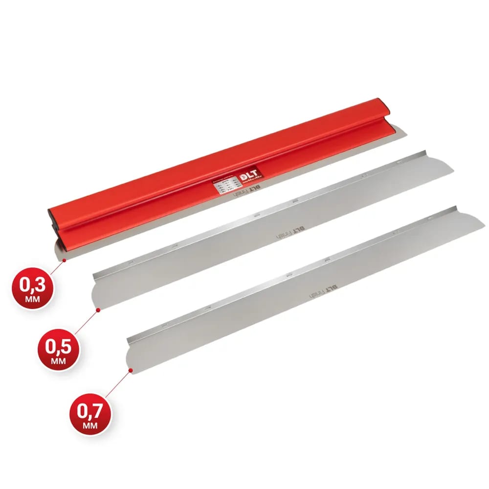 Комплектация «3 в 1» делает этот инструмент максимально универсальным: наличие сменных лезвий разной толщины (0.3, 0.5 и 0.7 мм) позволяет выполнять полный цикл работ — от стартового выравнивания до создания идеально гладкой поверхности «под покраску».