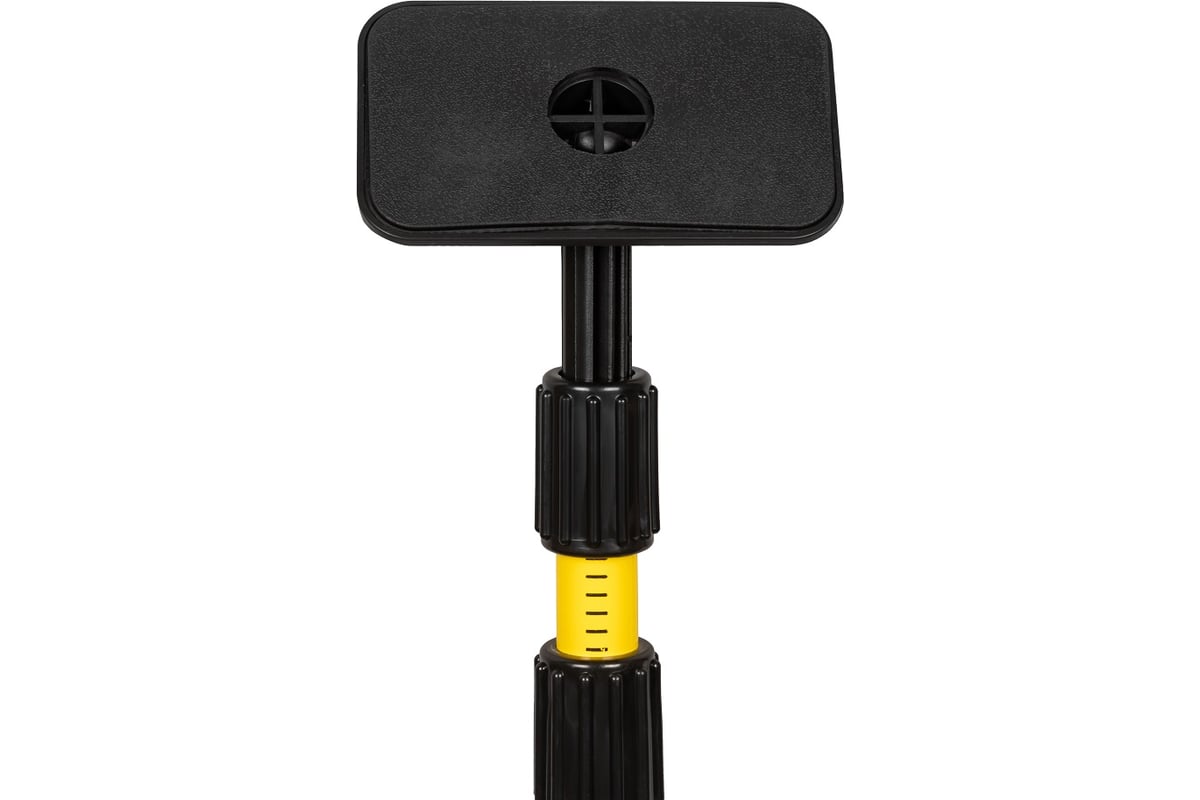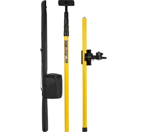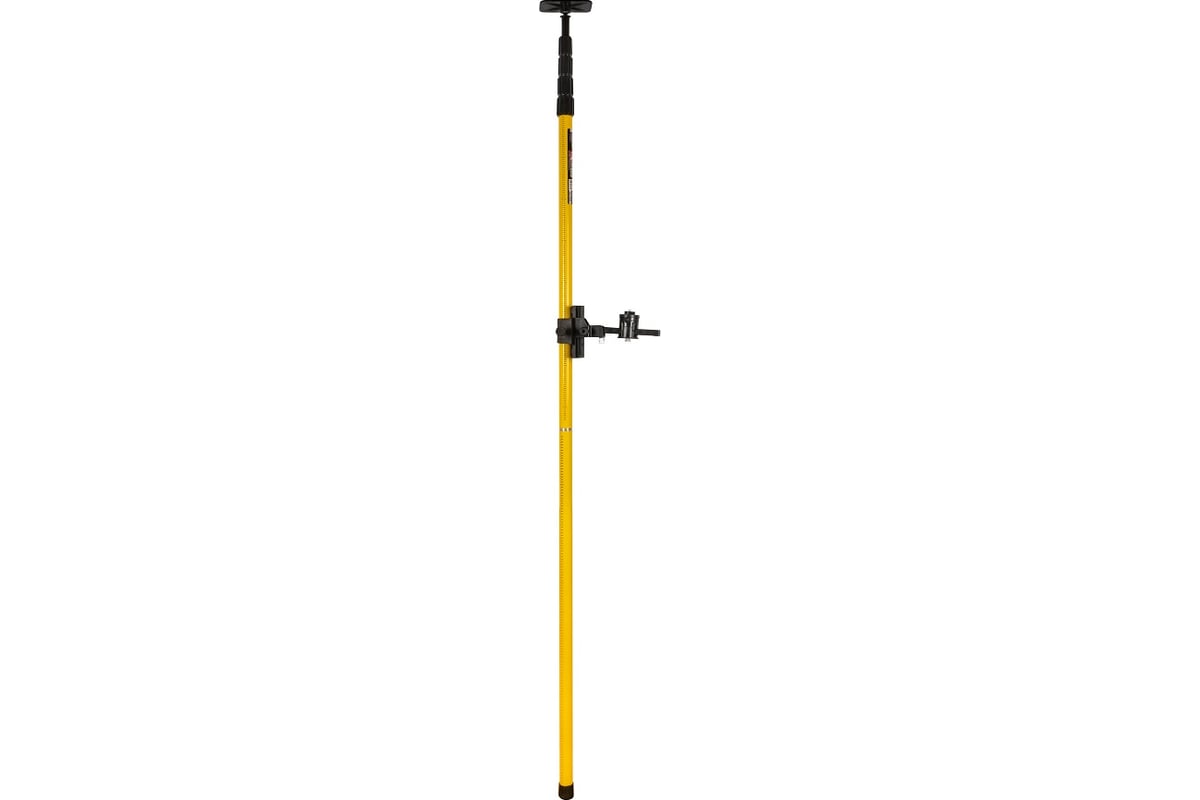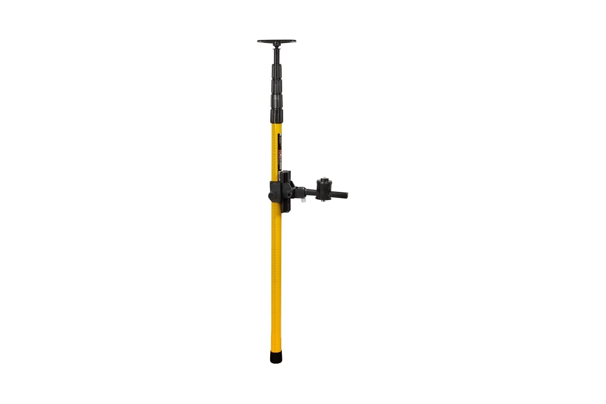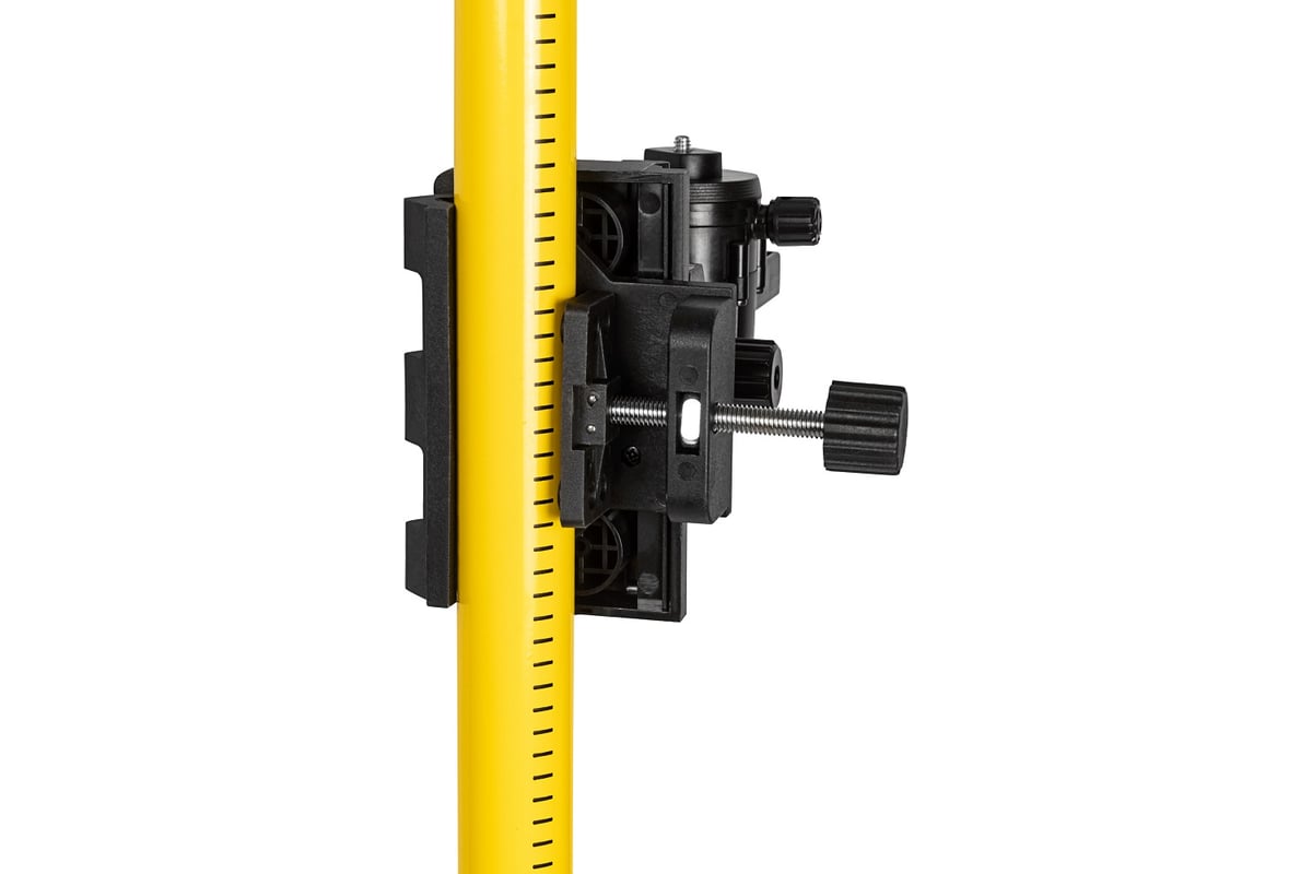 Телескопическая конструкция обеспечивает удобную регулировку высоты и устойчивость при работе. На штанге нанесена измерительная шкала, которая помогает быстро выставить уровень на нужной отметке. Платформа крепления перемещается по штанге и фиксируется на необходимой высоте. Для установки приборов предусмотрены стандартные крепления 1/4" и 5/8", поэтому штанга совместима с большинством лазерных уровней и построителей плоскостей.