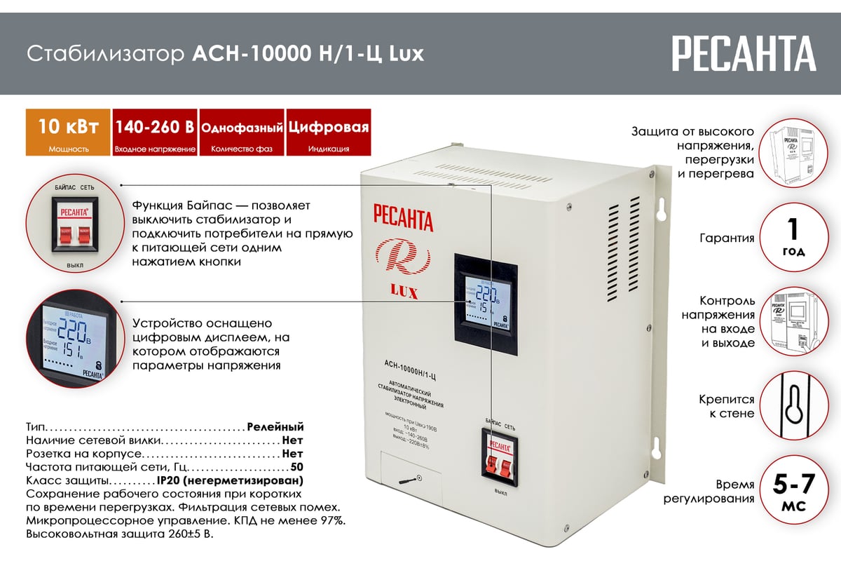 Ресанта АСН 10000 Н/1-Ц Lux — это цифровой однофазный стабилизатор релейного типа, предназначенный для защиты электросети частных домов, квартир и офисов в Луганске, Алчевске и по всей России. Модель Lux отличается настенным креплением, что экономит место, и быстрым временем отклика на скачки напряжения, обеспечивая сохранность бытовой техники.