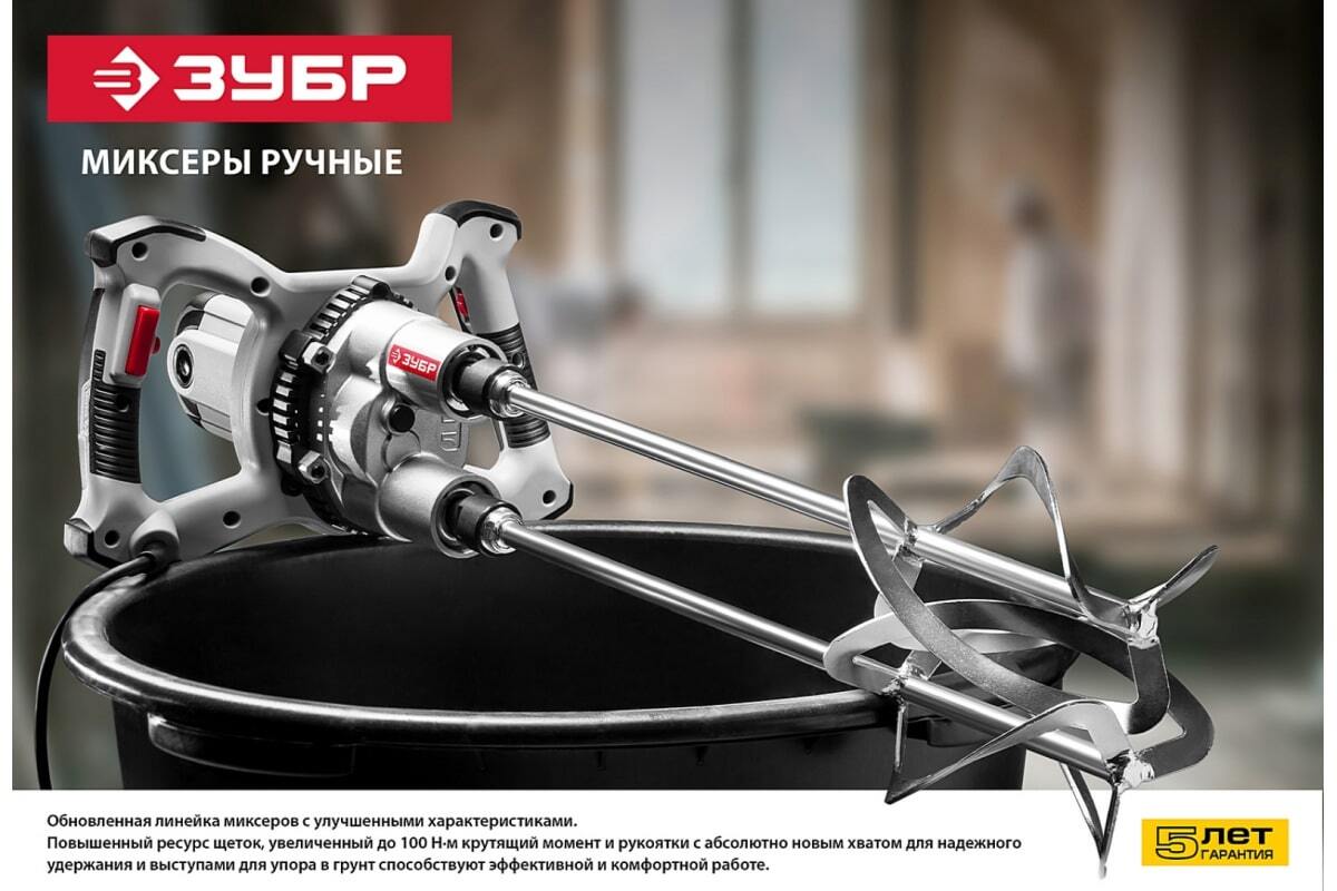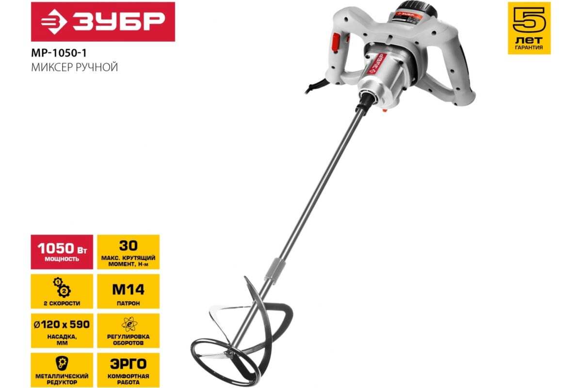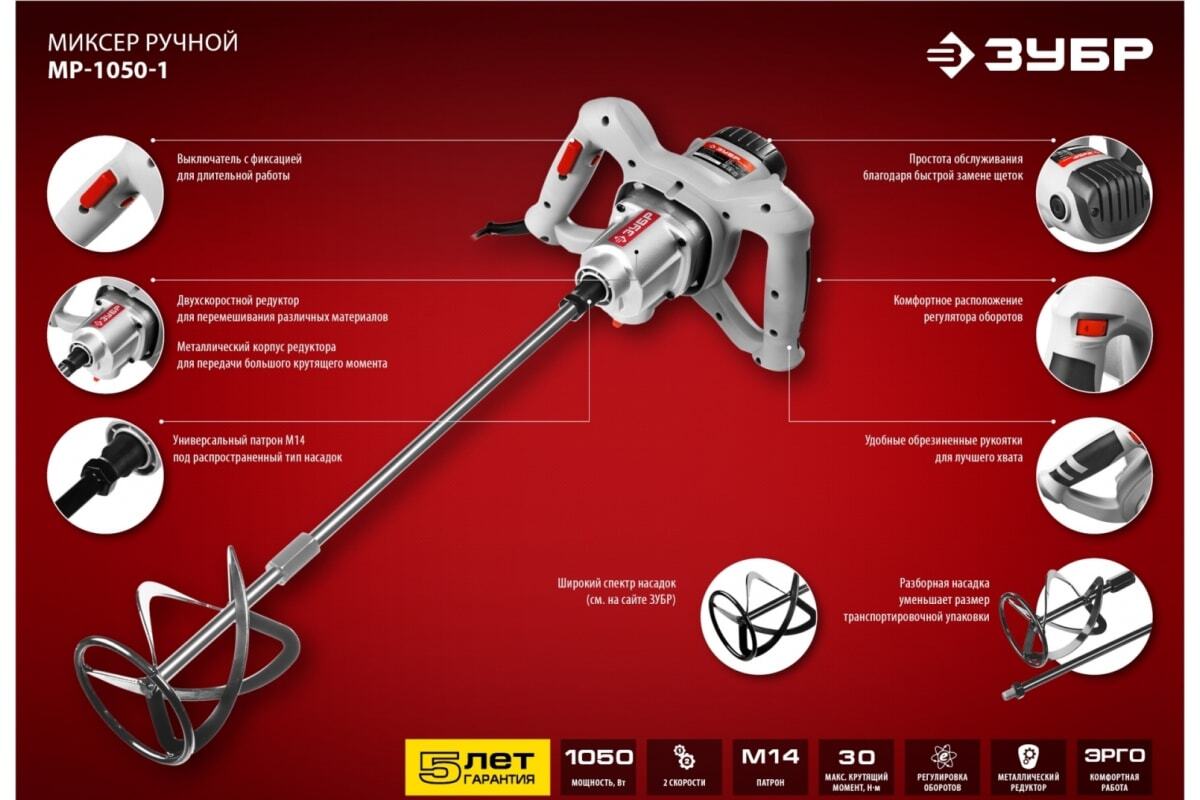 - Удобные рукоятки - для комфортной работы строительным миксером Зубр МР-1050-1;