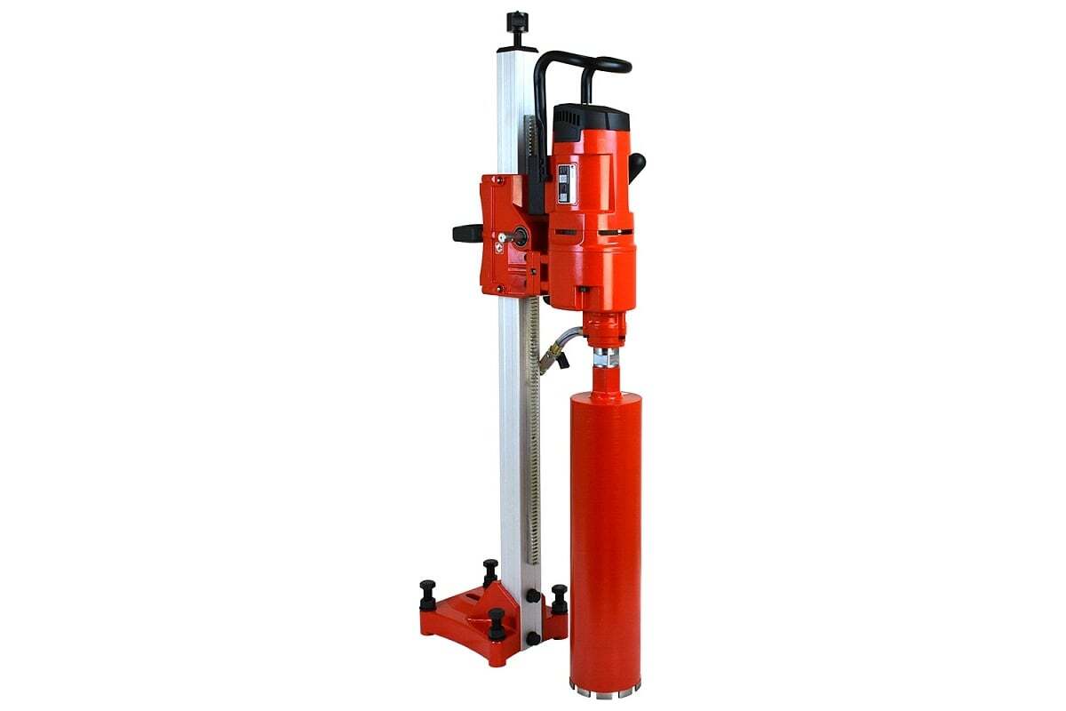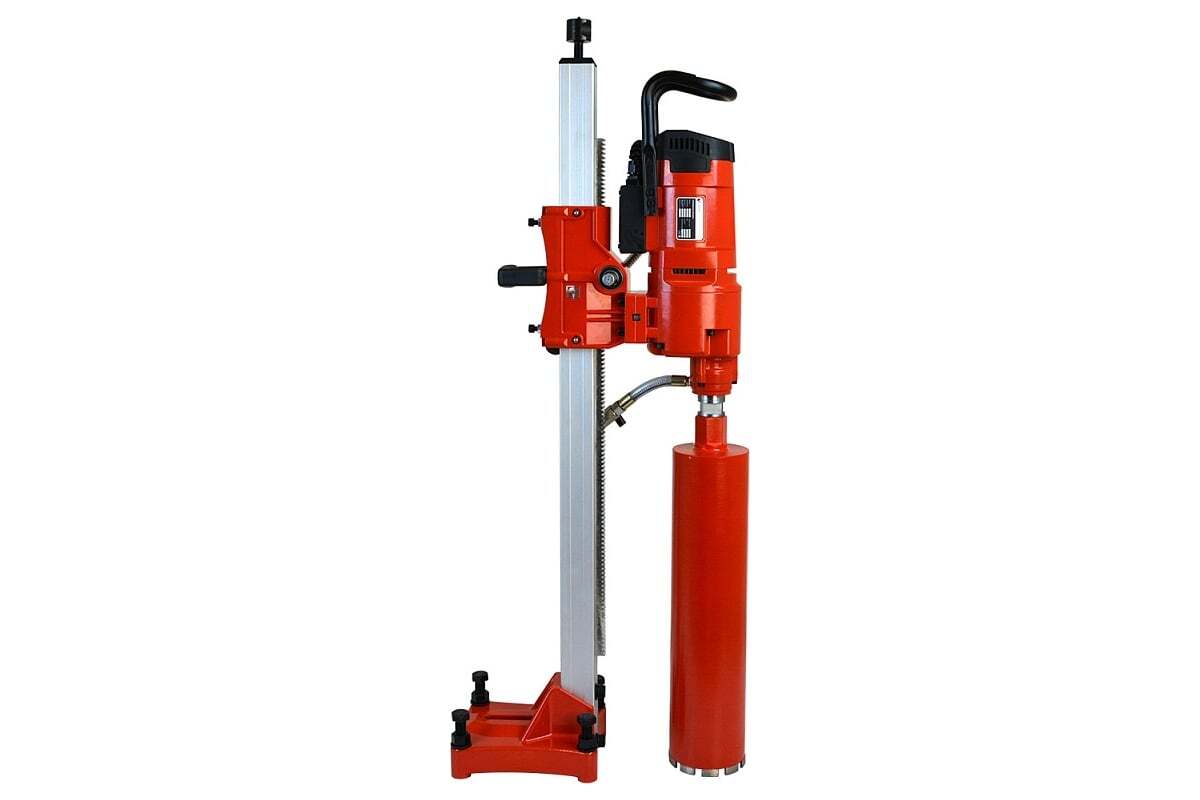 Наличие стойки упрощает продолжительную работу с большим усилием. Изделие обладает высокой мощностью, что позволяет сверлить отверстия в кирпиче 20-180 мм, а в бетоне 20-160 мм. Рабочий ход каретки 600 мм.