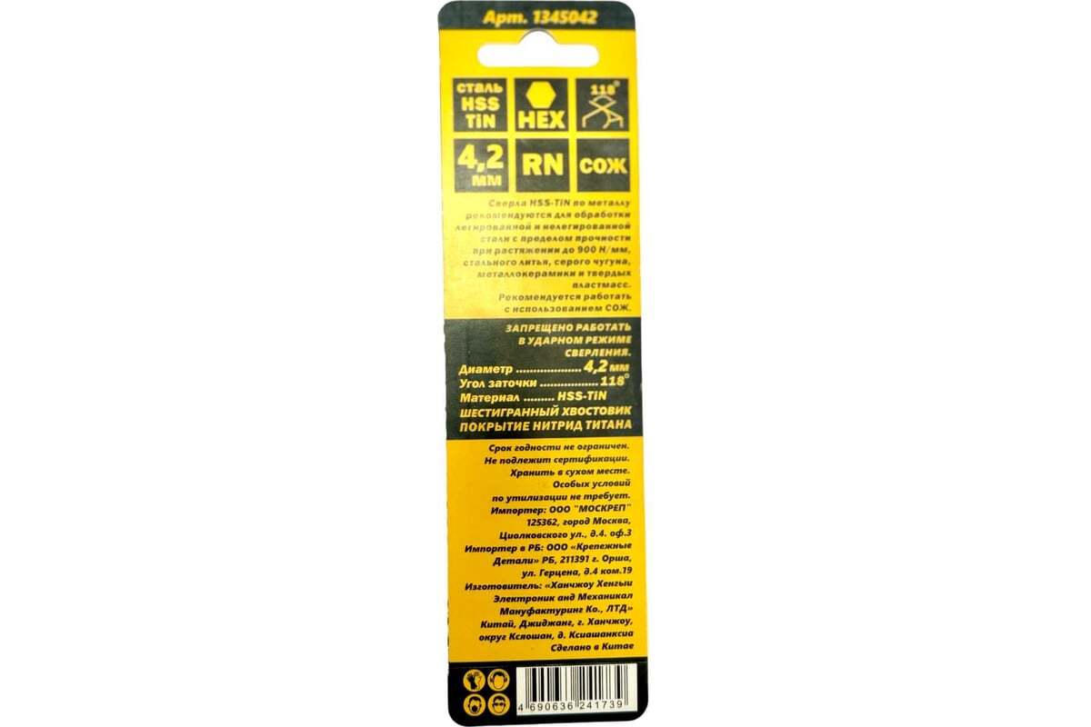 Сверло HSS TiN (быстрорежущая сталь с покрытием нитрид титана) по металлу с шестигранным хвостовиком 4,2 мм MosTek Шестигранный хвостовик, диаметр хвостовика - 6,35 мм Угол заточки 118⁰. Специальная заточка с подрезающими кромками обеспечивает идеальное засверливание и аккуратные кромки отверстия. Для сверления отверстий небольшого диаметра с помощью шуруповёрта. Рекомендуются для сверления легированной стали с пределом прочности до 900 Н/М, стального литься, серого чугуна, алюминия и пластика. Благодаря форме свёрла максимально плотно захватываются держателями инструмента и дают гарантию от проскальзывания. Обязательная круговая канавка предохраняет от выпадения и обеспечивает не только качественно проделанное отверстие, но и безопасность при работе с шуруповёртом.