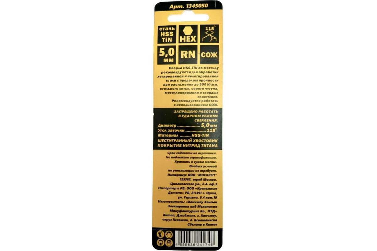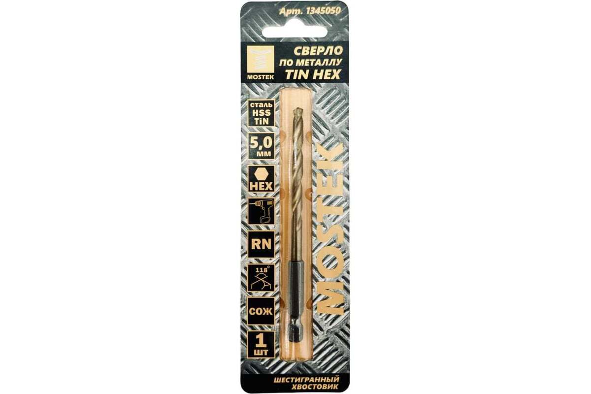 Сверло HSS TiN (быстрорежущая сталь с покрытием нитрид титана) по металлу с шестигранным хвостовиком 5 мм MosTek Шестигранный хвостовик, диаметр хвостовика - 6,35 мм Угол заточки 118⁰. Специальная заточка с подрезающими кромками обеспечивает идеальное засверливание и аккуратные кромки отверстия. Для сверления отверстий небольшого диаметра с помощью шуруповёрта. Рекомендуются для сверления легированной стали с пределом прочности до 900 Н/М, стального литься, серого чугуна, алюминия и пластика. Благодаря форме свёрла максимально плотно захватываются держателями инструмента и дают гарантию от проскальзывания. Обязательная круговая канавка предохраняет от выпадения и обеспечивает не только качественно проделанное отверстие, но и безопасность при работе с шуруповёртом.