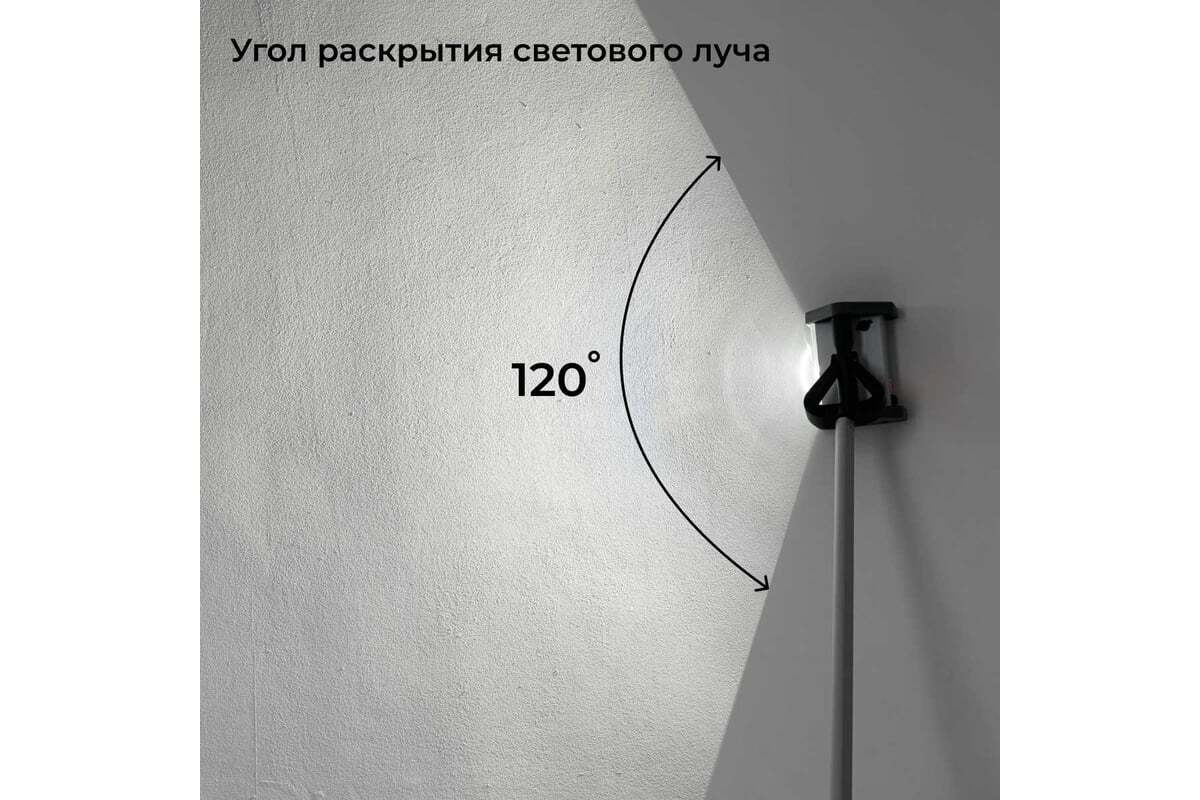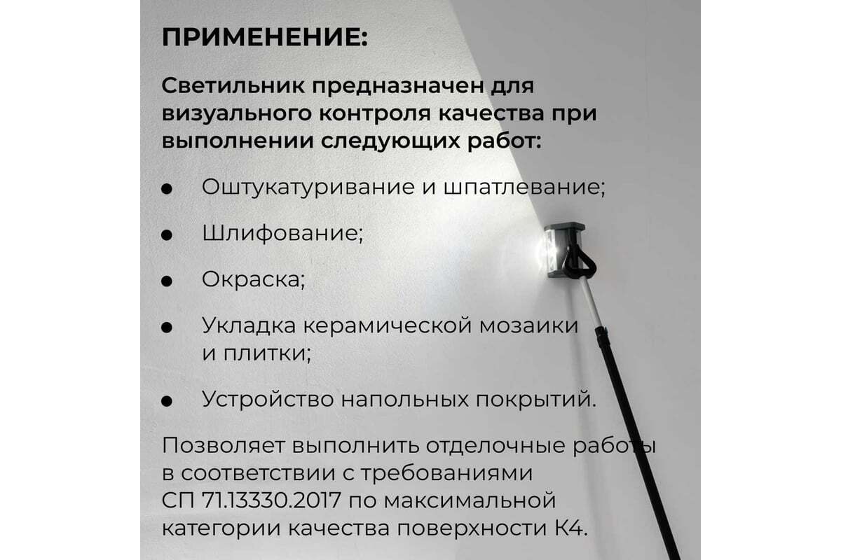 Модель работает от встроенного аккумулятора и может использоваться автономно примерно 6,5–50 часов в зависимости от выбранного режима яркости. Максимальная сила света достигает примерно 4800 кд, что позволяет проверять как крупные неровности плоскости, так и мелкие дефекты перед финальной покраской. Управление возможно кнопками на корпусе или через Bluetooth-приложение, где можно регулировать яркость, объединять несколько светильников в одну группу и контролировать уровень заряда. Вес светильника около 0,9 кг, поэтому его удобно использовать как переносной инструмент при проверке поверхности на разных этапах отделочных работ.