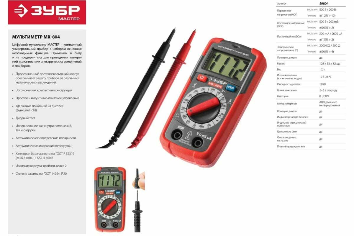 Мультиметр МХ-804 ЗУБР 59804 используется при обслуживании и диагностике электрических приборов и оборудования. Способен измерить напряжение, силу тока и сопротивление. Имеет функции прозвонки цепи и тестирования диодов.
