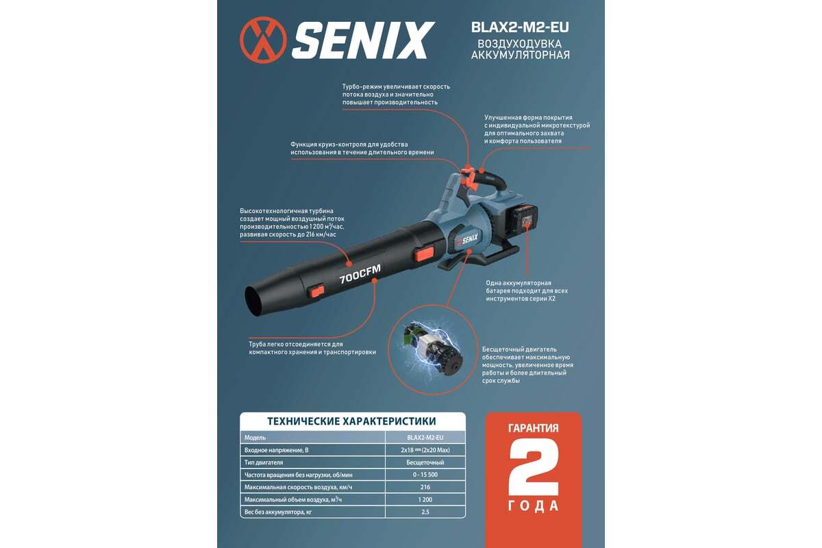 Аккумуляторная воздуходувка SENIX BLAX2-M2-EU — это инновационное решение для быстрой и эффективной уборки, которое станет незаменимым помощником в вашем доме и на участке. Благодаря передовой технологии и мощному бесщеточному двигателю, она обеспечивает мощный поток воздуха до 216 м/с, позволяя легко справляться с любыми задачами — от подметания проезжей части и тротуара до уборки опавших листьев в осенний день.